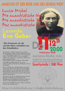 Do 11.12.2025 Lesung: Lesende Eva Geber Louise Michel Die anarchistische Idee Die anarchistische Tat Das anarchistische Glück