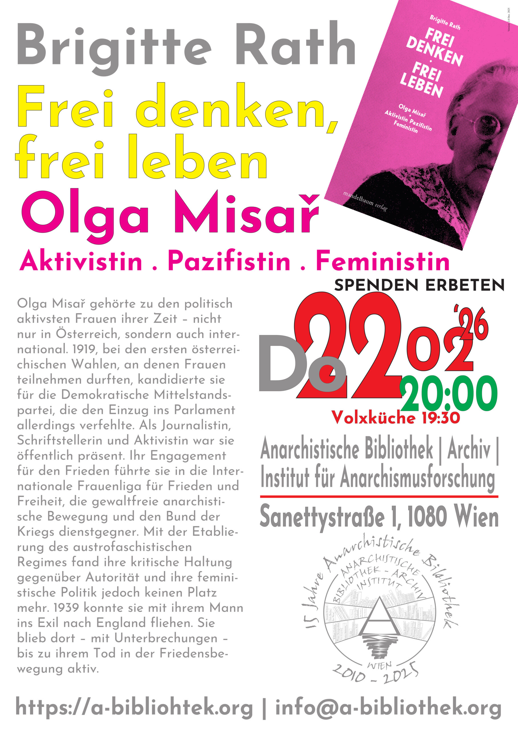 Do 22.02.2026 Vo-Kü 19:30 20:00 Lesung: Brigitte Rath Frei denken, frei leben Olga Misař Aktivistin . Pazifistin . Feministin